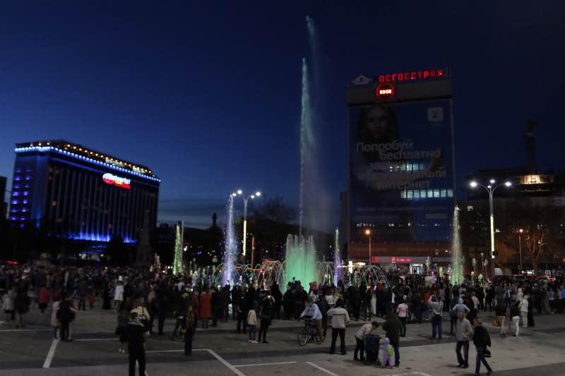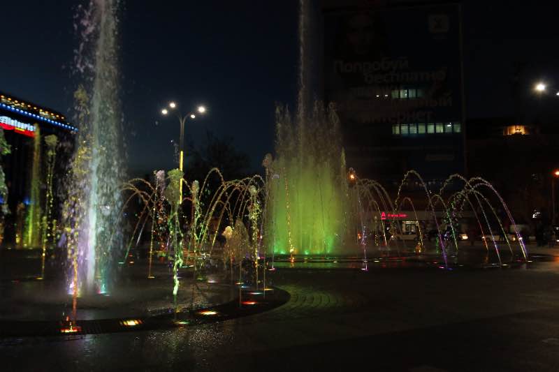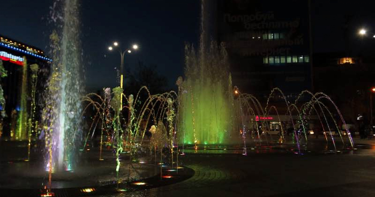 Сегодня вечером в кубанской столице произвели пуск основных городских фонтанов. Включению предшествовали разножанровые театрализованные представления. Первые фонтаны заработали в 19.00. Последним включили главный плоскостной фонтан на Театральной площади — в 20.00.