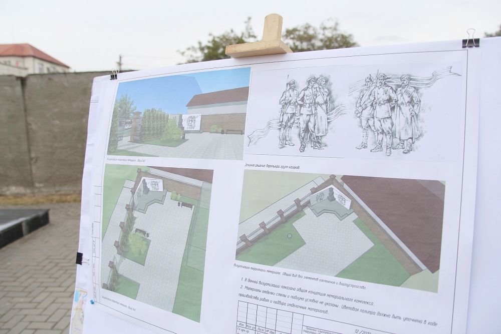 Как рассказал директор МКУ «Управление коммунального хозяйства и благоустройства» Дмитрий Буряк, уже началось изготовление мемориала высотой 2,5 м. По проекту он состоит из двух равных частей — по 4 метра каждая. На гранитном основании будет сделана скульптурная композиция из бронзы. Мемориал разместится в углу кладбища, неподалеку от места захоронения останков казаков, погибших во время Гражданской войны.