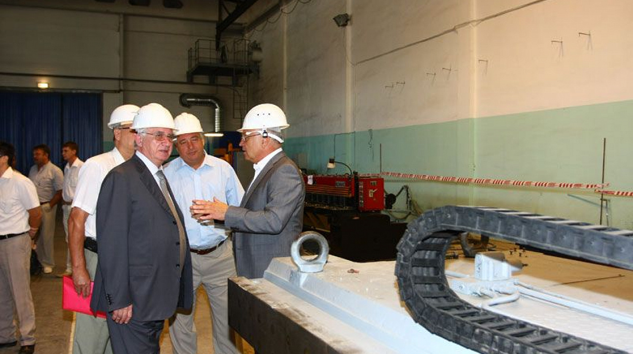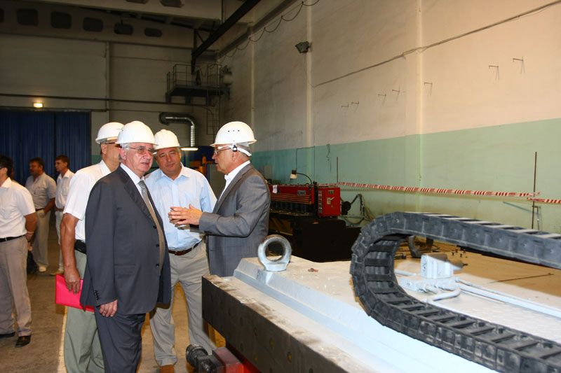 Одним из первых в ходе осмотра завода стал цех металлоконструкций. Здесь установлено несколько уникальных станков: плазменной резки, гибочный станок, координатно-расточный станок. В цеху работают высококлассные специалисты. В течение нескольких минут рабочие изготовили своеобразный сувенир - они филигранно отрезали лист металла, чтобы затем, выбить на заготовке название кубанской столицы.