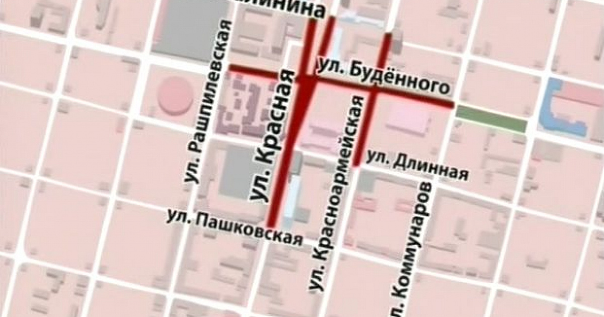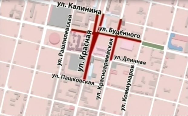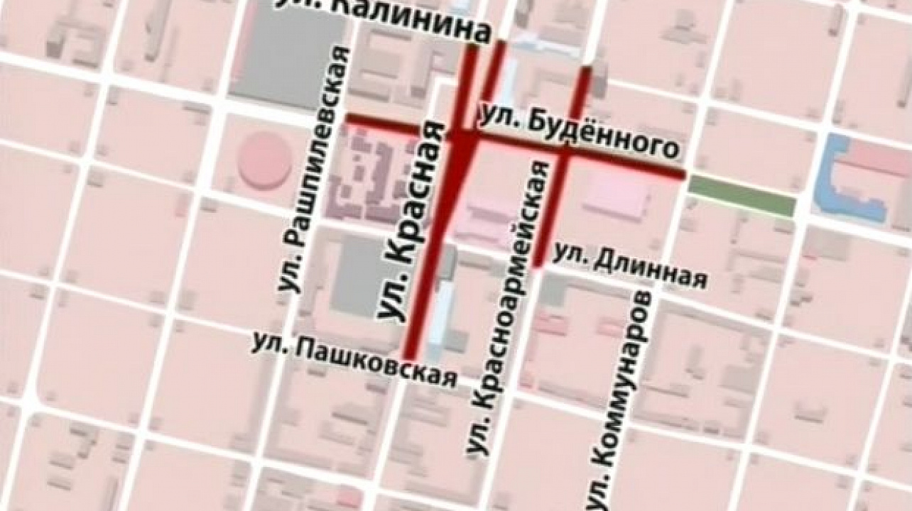 - улицу Красную, от улицы Пашковской до улицы Калинина, улицу Красноармейскую, от улицы Длинной до улицы Калинина, улицу Будённого, от улицы Рашпилевской до улицы Коммунаров, с 06.00 29 сентября 2012 года до 23.00 30 сентября 2012 года;