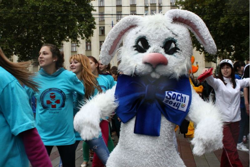Хорошее настроение всем участникам праздничной зарядки помогли создать специальные помощники-талисманы ведущих спортивных краснодарских клубов, большие ростовые куклы: Ястреб, талисман волейбольного клуба «Динамо», Грифон, талисман хоккейного клуба «Кубань», Лягушка, талисман ФК «Кубань», а также Зубастик, талисман баскетбольного клуба «Локомотив-Кубань».