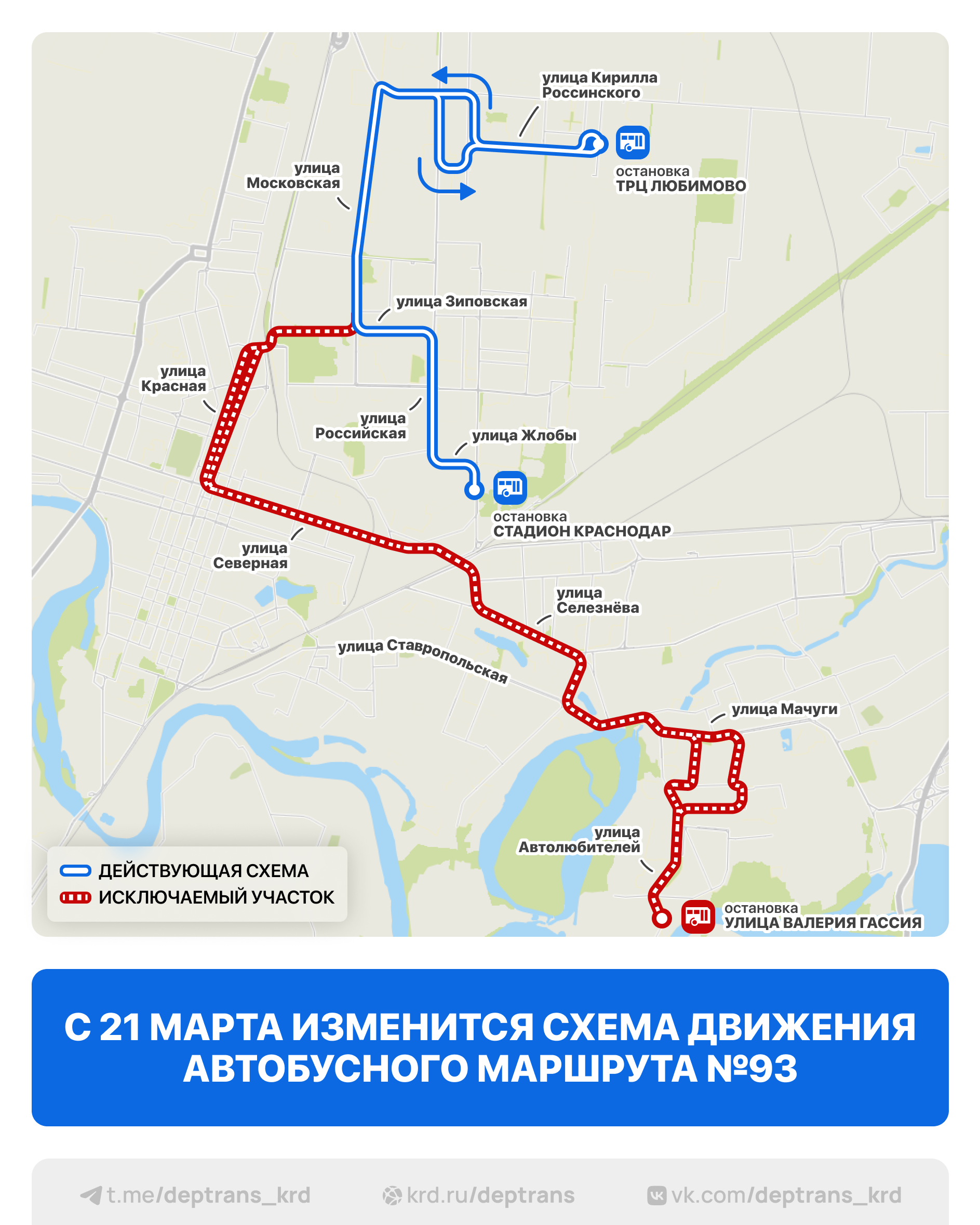 В настоящее время автобусы этого маршрута следуют от остановки «ТРЦ Любимово» до остановки «ул. им. Валерия Гассия» по улицам им. Россинского, Московской, Красной, Северной, им. Селезнёва и им. Мачуги. С субботы, 21 марта, транспорт будет курсировать от остановки «ТРЦ Любимово» до остановки «стадион «Краснодар» по улицам им. Россинского, Московской, Зиповской, Российской и им. Жлобы.