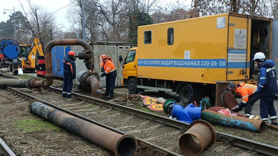 Специалисты «Краснодар Водоканала» работают круглосуточно на месте провала на ул. Московской