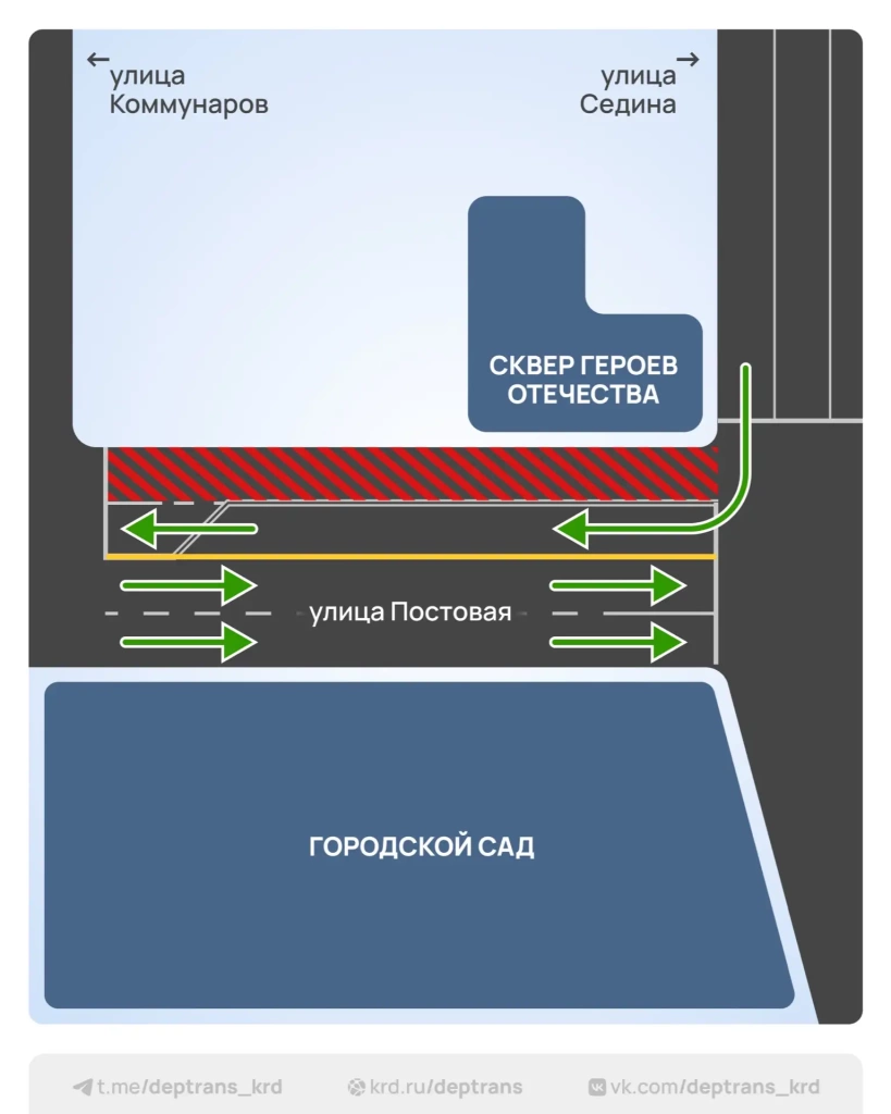 Движение транспорта по ул. Постовой от ул. им. Митрофана Седина до ул. Коммунаров будет осуществляться по встречной полосе. В противоположном направлении, от ул. Коммунаров до ул. им. Митрофана Седина, движение будет организовано по оставшимся двум полосам.
