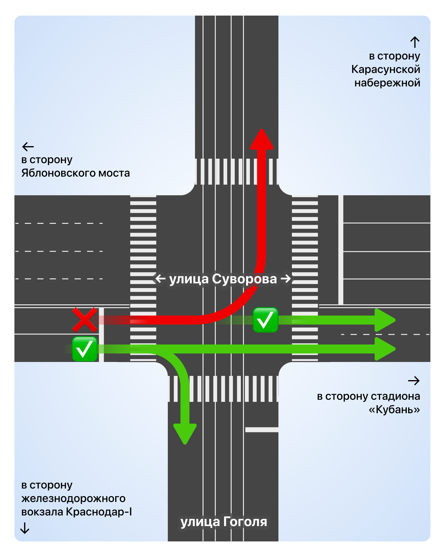 Теперь при движении в сторону стадиона «Кубань» по ул. им. Суворова будет запрещён левый поворот на ул. им. Гоголя. Автомобилисты, как и прежде, смогут поворачивать направо к железнодорожному вокзалу