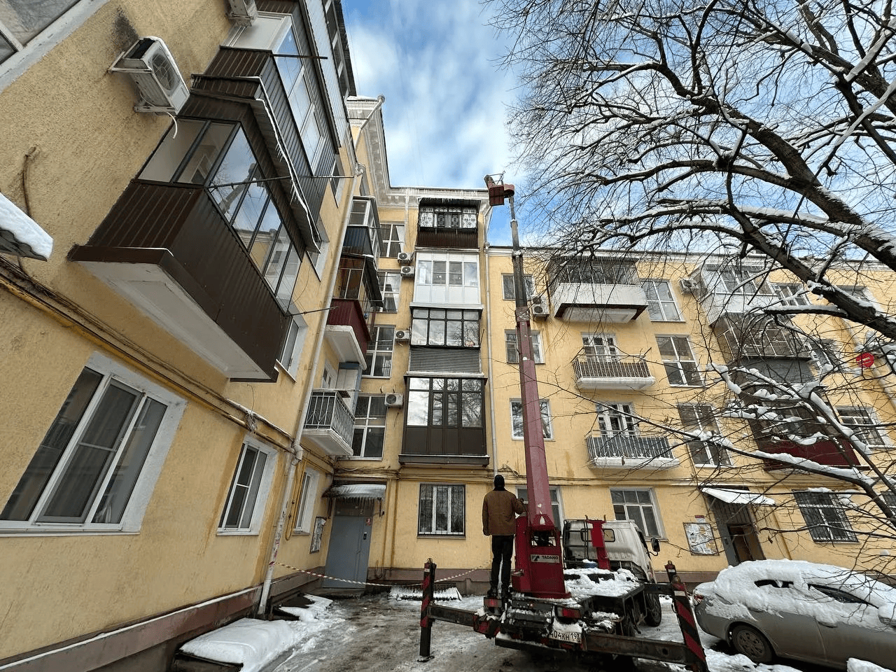 15 января 2026В краевом центре продолжается работа по очистке территорий от снега и льда. Во дворах многоквартирных домов её проводят сотрудники управляющих компаний и ТСЖ. В числе их задач, в том числе, очистка зданий от сосулек.