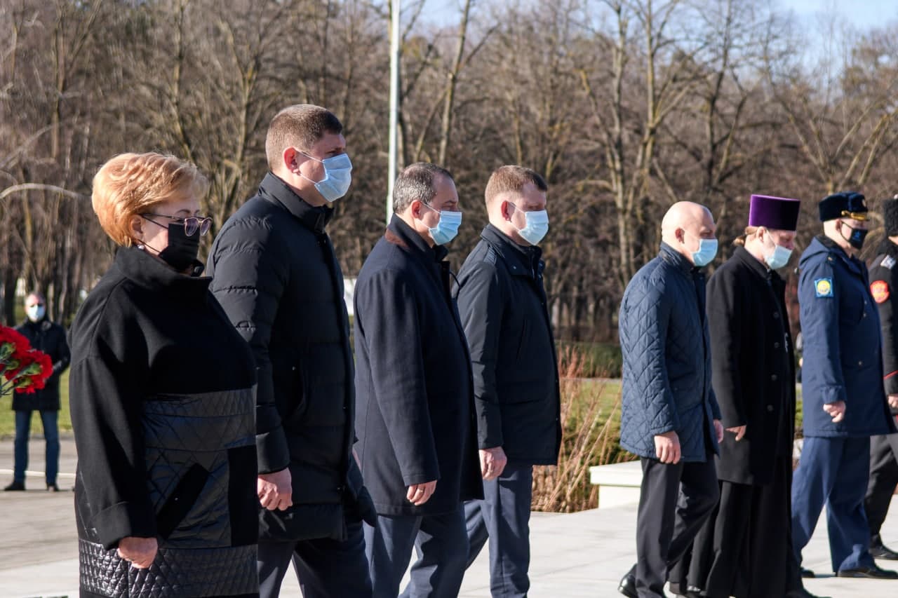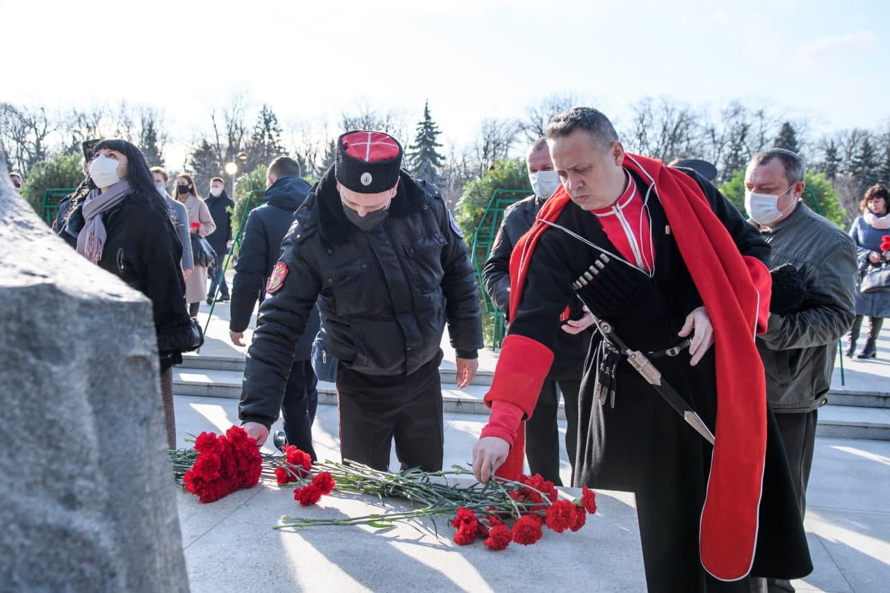 Под звуки траурного марша в исполнении военного оркестра участники церемонии возложили цветы и венки к подножию монумента. Память погибших почтили минутой молчания. Прозвучали гимны России, Кубани и Краснодара.