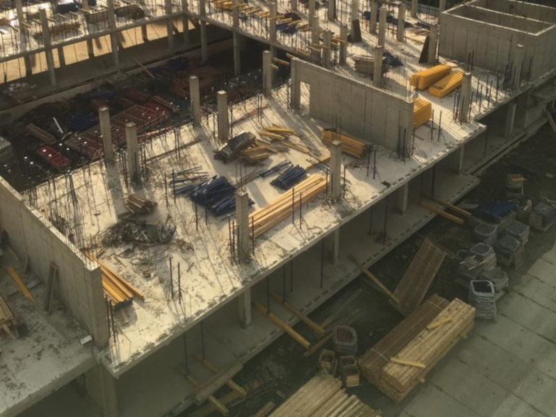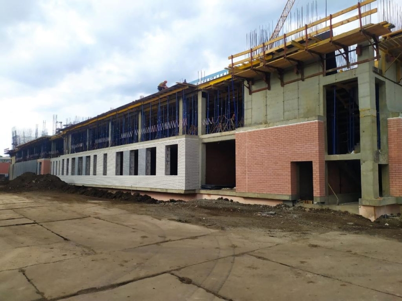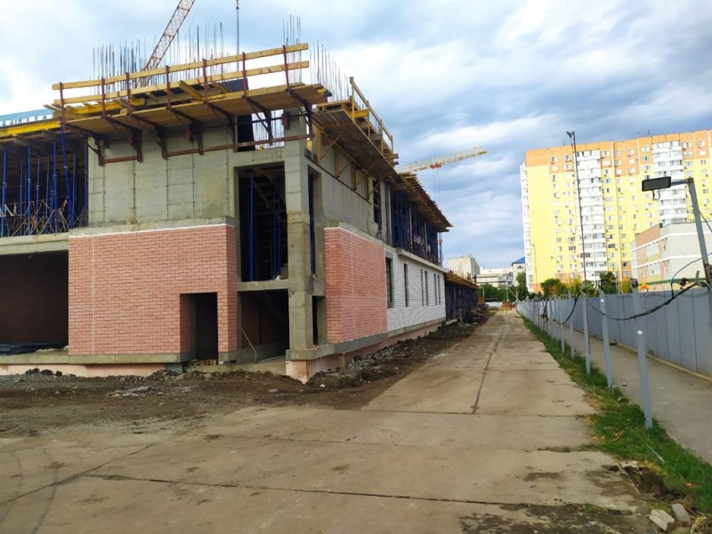 Сейчас на строительной площадке объекта проходит армирование и бетонирование фундамента и возведённых помещений, строятся внутренние и наружные стены, идёт утепление потолка цокольного этажа.