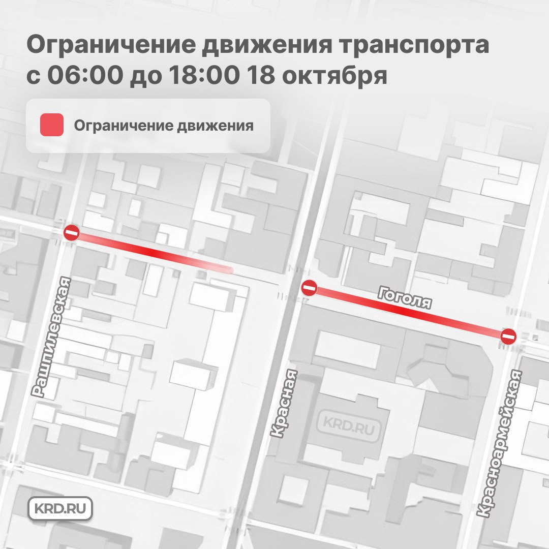 18 октября с 06:00 до 18:00 нельзя будет проехать по ул. им. Гоголя от ул. Красноармейской до ул. Рашпилевской. Это необходимо для проведения Всероссийского конкурса художественной самодеятельности, посвящённого Дню освобождения Краснодарского края от