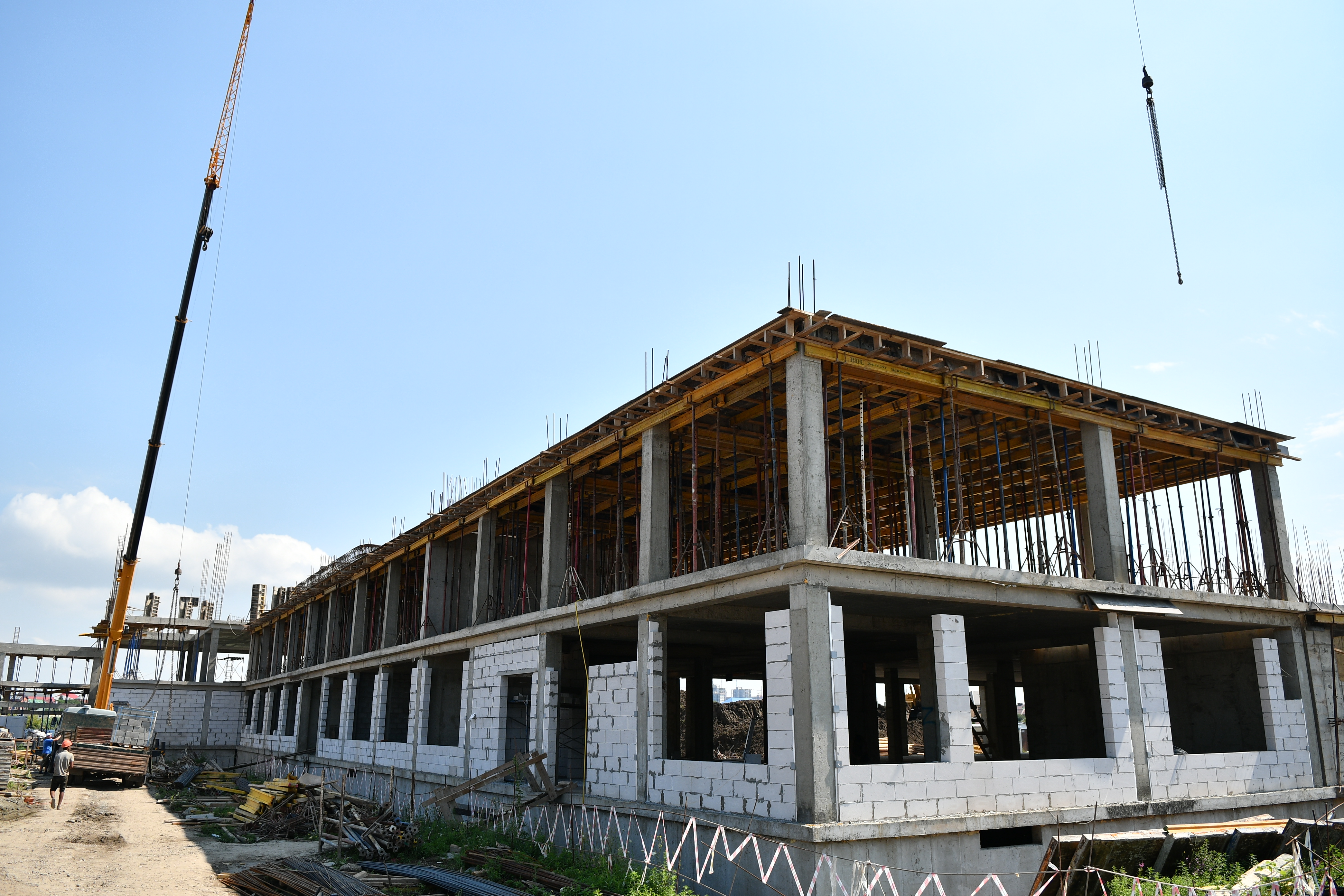 На одном из блоков будущей школы по ул. Первомайской в ближайшее время приступят к штукатурке первого этажа, в конце месяца начнут делать кровлю. Полностью закрыть контур здания рассчитывают в октябре этого года.