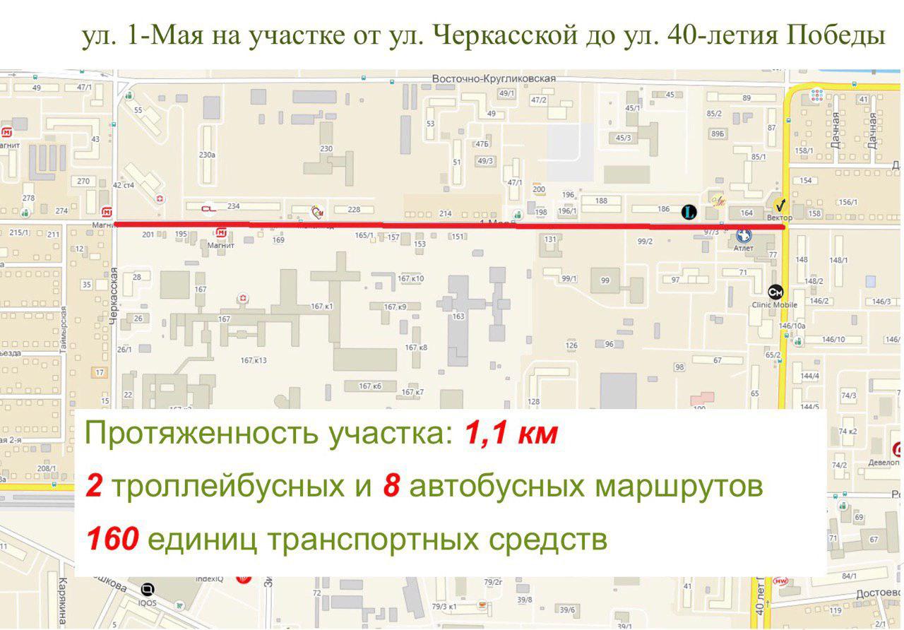 — 30 июля — выделенная полоса на участке ул. им. 1-го Мая — от ул. Черкасской до ул. им. 40-летия Победы протяженностью 1,1 км.