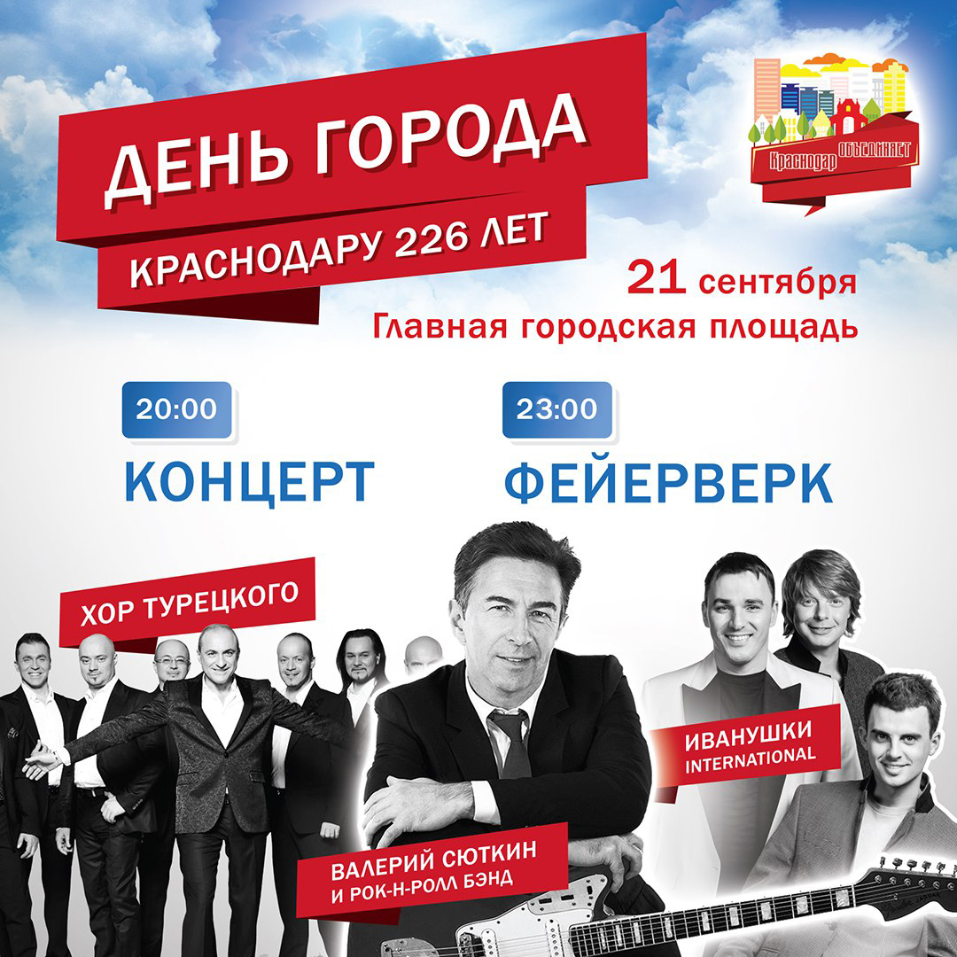 Празднование 226-й годовщины основания Краснодара пройдет 21 и 22 сентября. От гастрономических фестивалей - до главных вечерних концертов с выступлением известных исполнителей. Всего состоятся больше 150 различных событий, 5 концертов завершатся фейерверками.